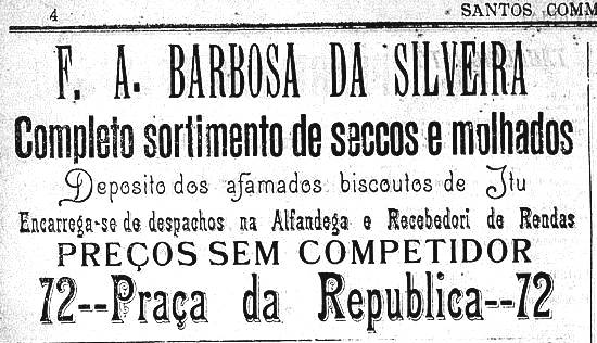 F. A. Barbosa da Silveira - secos e molhados - "Depósito dos afamados biscoutos de Itu", encarrega-se de despachos na Alfândega e Recebedoria de Rendas