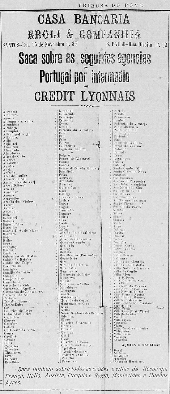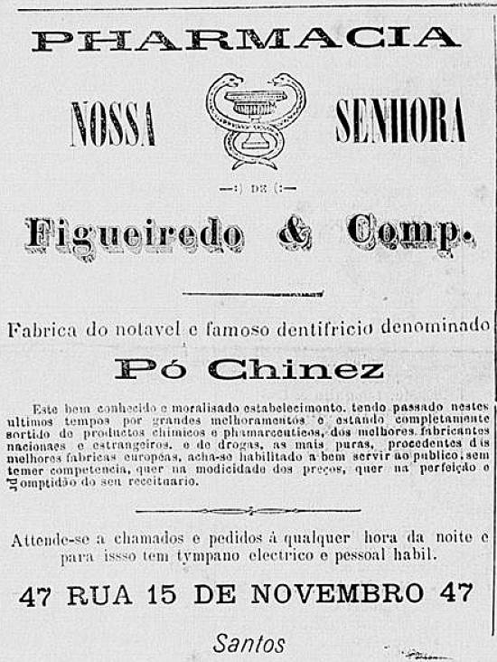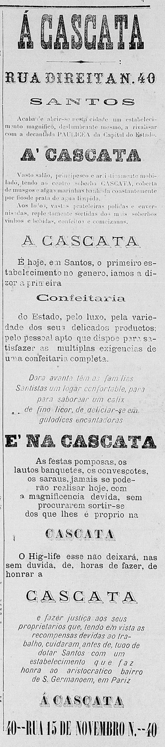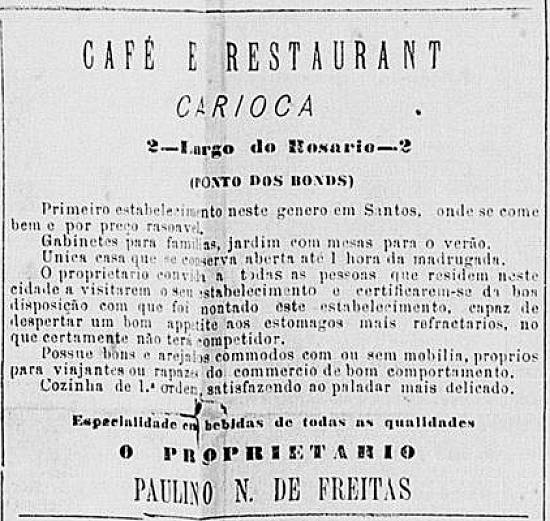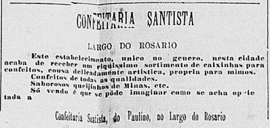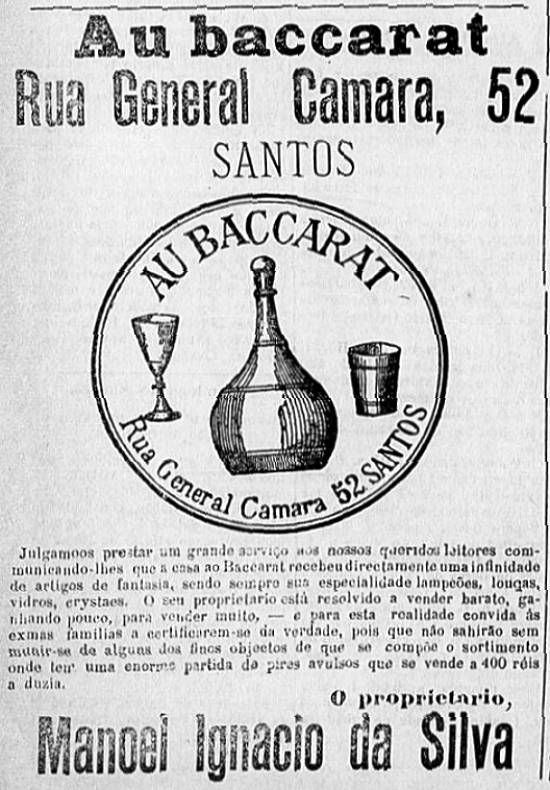 Confeitaria Santista, de Manoel Ignacio da Silva, julga "prestar um grande serviço aos nossos queridos leitores comunicando-lhes que a casa Ao Baccarat recebeu diretamente uma infinidade de artigos de fantasia, sendo sempre sua especialidade lampiões, louças, vidros, cristais. O seu proprietário está resolvido a vender barato, ganhando pouco, para vender muito - e para esta realidade convida as exmas. famílias a certificarem-se da verdade, pois que não sairão sem munir-se de alguns dos finos objetos de que se compõe o sortimento onde tem uma enorme partida de pires avuulsos que se vende a 400 réis a dúzia"