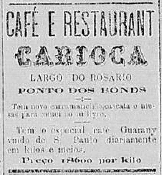 O Café e Restaurante Carioca funcionava no Largo do Rosário (atual Praça Rui Barbosa), defronte ao ponto dos bondes, destacando as instalações renovadas, com carramanchão, cascata e mesas para comer ao ar livre, além do especial café Guarany vindo diariamente da capital paulista Publicado no jornal santista Tribuna do Povo, em 21 de outubro de 1899, página 4 Imagem: Hemeroteca da Biblioteca Nacional - Rio de Janeiro/RJ