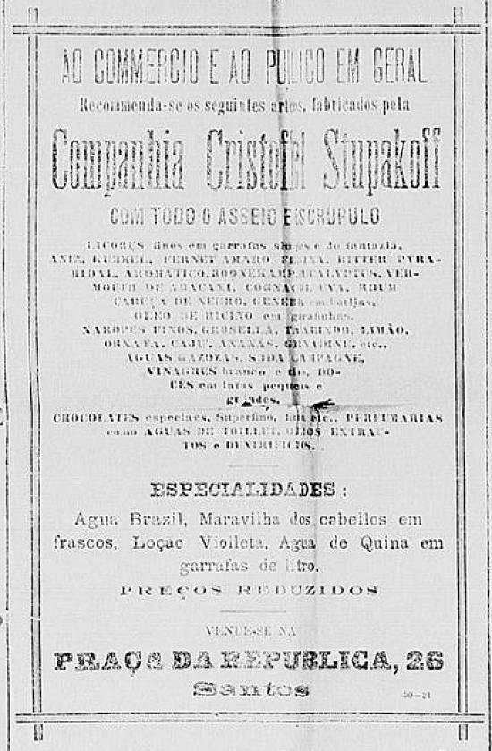 Companhia Cristoffel Stupakoff comercializa bebidas, loções, produtos para cabelo, chocolates, perfumarias, "com todo asseio e escrúpulo"