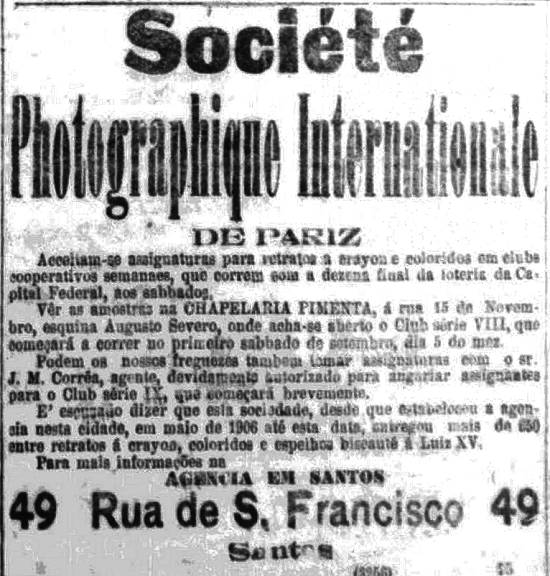Société Photographique Internationale, de Paris, com agência em Santos na antiga Rua de S. Francisco (atual Rua do Comércio), 49. Vende (em formato de clubes cooperativos semanais) assinaturas para retratos a crayon e coloridos, tendo - desde maio de 1906 - entregue mais de 650 retratos a crayon, coloridos e espelhos bisotados à Luiz XV