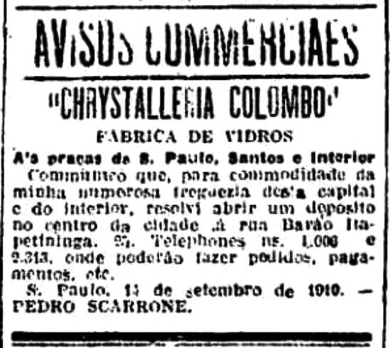 Chrystalleria Colombo - aviso às praças - abertura de depósito na capital paulista