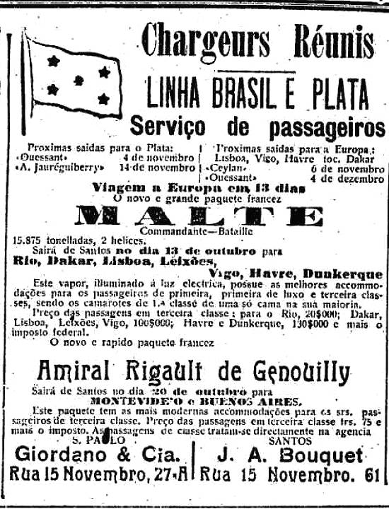 J. A. Bouquet - agentes em Santos da armadora francesa Chargeurs Réunis