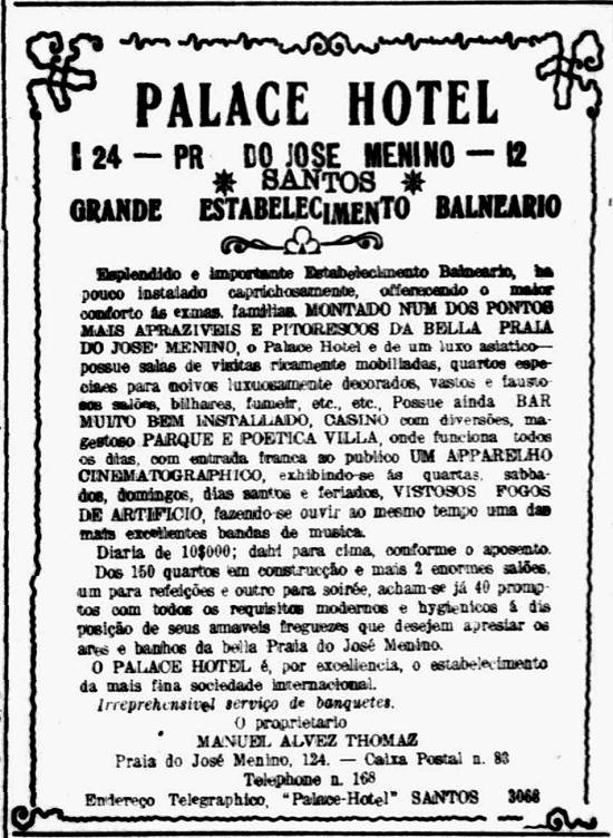 Palace Hotel, de Manuel Alvez Thomaz, "grande estabelecimento balneário há pouco instalado" na Praia do José Menino, 124, com "luxo asiático", bar, cassino, aparelho cinematográfico, vistosos fogos de artifício, bandas de música etc.