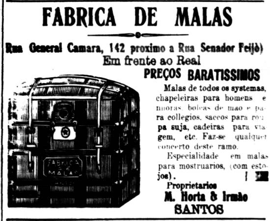 Cigarros Borboleta e Laurinha "são os melhores premiados com gramofones, relógios de ouro e mais objetos de utilidade, chegados há pouco de Berlim". Fábrica e depósito, de Manoel Ramos Junior, na Rua General Câmara, 93, em Santos