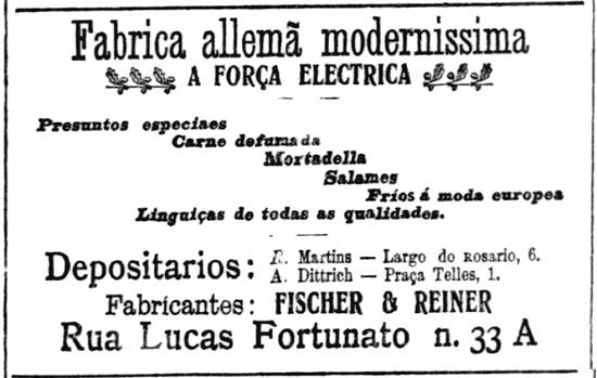 Fábrica alemã moderníssima à força elétrica, de Fischer & Reiner, produtora de presuntos especiais, carne defumada, mortadela, salames, frios à moda europeia e linguiças de todas as qualidades