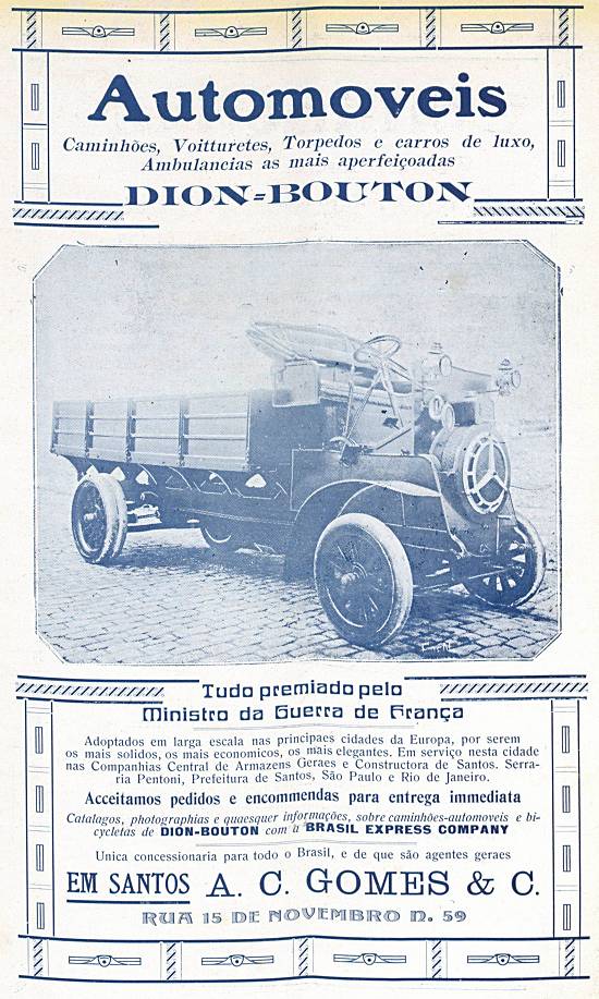 Automóveis Dion-Bouton, "tudo premiado pelo ministro da Guerra de França" - em Santos, concessionária A. C. Gomes & C, "Adoptados em larga escala nas principais cicades da Europa, por serem os mais solidos, os mais economicos, os mais elegantes. Em serviço nesta cidade nas Companhias Central de Armazéns Gerais e Constructora de Santos, Serraria Pentoni, Prefeitura de Santos, São Paulo e Rio de Janeiro".