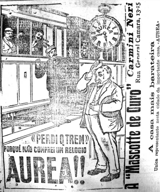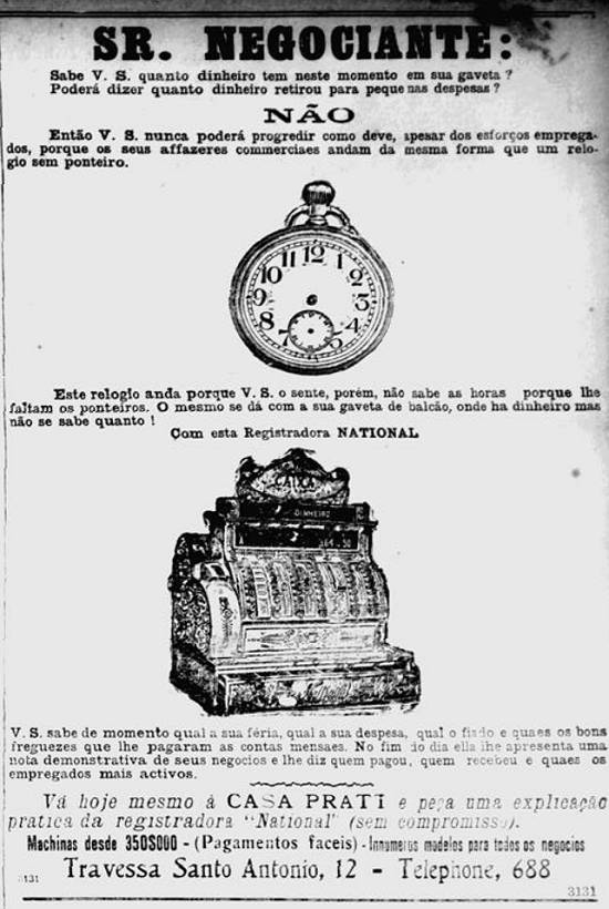 Casa Pratt - caixa registradora National, na antiga Travessa Santo Antonio, 12, "Este relógio anda porque V.S. o sente, porém não sabe as horas, porque lhe faltam os ponteiros. O mesmo se dá com a sua gaveta de balcão, onde há dinheiro mas não se sabe quanto! Com esta Registradora National V. S. sabe de momento qual a sua féria, qual a sua despesa, qual o fiado e quais os bons fregueses que lhe pagaram as contas mensais. No fim do dia ela lhe apresenta uma nota demonstrativa de seus negócios e lhe diz quem pagou, quem recebeu e quais os empregados mais ativos". Travessa Santo Antonio era o nome antigo da quadra final da Rua XV de Novembro (ex-Vinte e Cinco de Março), entre a Rua do Comércio (ex-Santo Antonio) e a Praça dos Andradas.