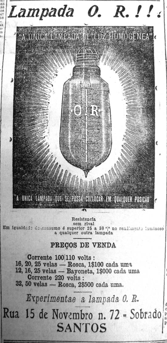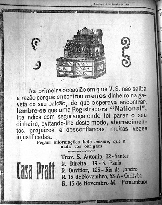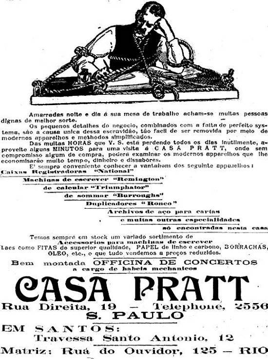 Casa Pratt, em Santos na Travessa Santo Antonio, 12: "Amarradas noite e dia à sua mesa de trabalho acham-se muitas pessoas dignas de melhor sorte. Os pequenos detalhes do negócio, combinados com a falta de perfeito sistema, são a causa única dessa escravidão, tão fácil de ser resolvida por meio de modernos aparelhos e métodos simplificados. Das muitas horas que Vossa Senhoria está perdendo todos os dias inutilmente, aproveite alguns minutos para uma visita à Casa Pratt, onde sem compromisso algum de compra, poderá examinar os modernos aparelhos que lhe economizarão muito tempo, dinheiro e dissabores. É sempre conveniente conhecer a vantagem dos seguintes aparelhos: caixas registradoras National, Máquinas de escrever Remington, de calcular Triumphator, de somar Burroughs, duplicadores Ronco, arquivos de aço para cartas e muitas outras especialidades"