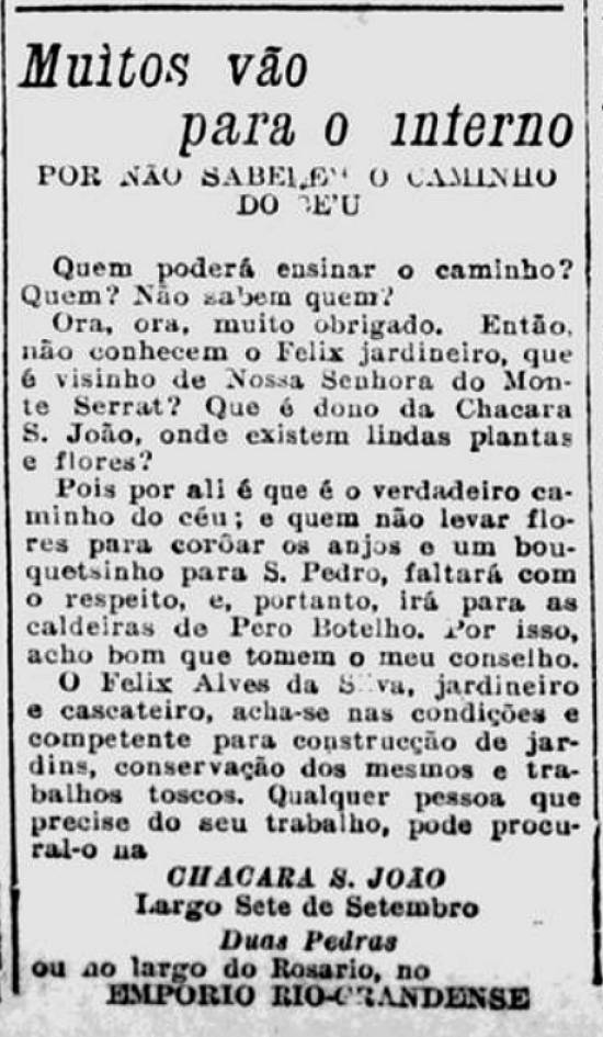 "Muitos vão para o inferno..." - Acredite, este é um anúncio de serviços de jardinagem. Os interessados poderiam procurar o profissional Felix Alves da Silva no Empório Riograndense, no antigo Largo do Rosário (atual Praça Rui Barbosa), ou no Largo Sete de Setembro, em Duas Pedras