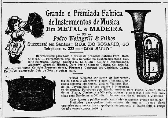 "Grande e Premiada Fábrica de Instrumentos de Música em Metal e Madeira - de Pedro Weingrill & Filhos" - sucursal em santos: Casa Mattiy, na anttiga Rua do Rosário (atual Rua João Pessoa)