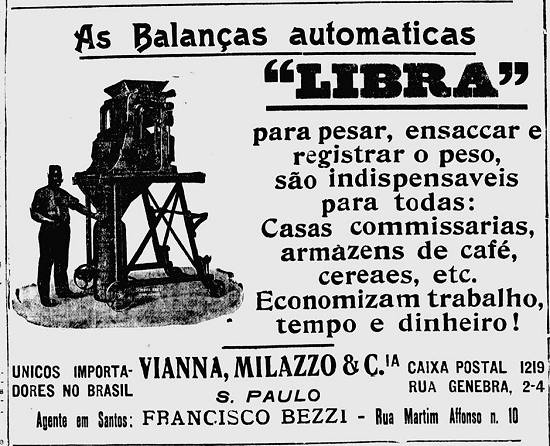 Balanças automáticas Libra, para pesar, ensacar e registrar o peso, indispensáveis para casas comissárias, armazéns de café, cereais etc. Únicos importadores no Brasil: Vianna, Milazzo & Cia., na capital paulista. Agente em Santos: Francisco Bezzi