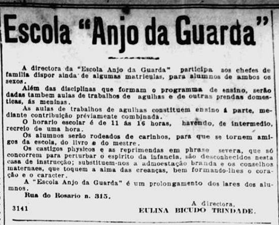 Escola "Anjo da Guarda" - matrículas. "(...) Os alunos serão rodeados de carinhos, para que se tornem amigos da escola, do livro e do mestre. Os casttigos físicos e as reprimendas em frase severa, que só concorrem para perturbar o espírito da infância, são desconhecidos nesta casa de instrução; substituem-nos a admoestação branda e os conselhos maternais, que toquem a alma das crianças, bem formando-=lhes o coração e o caráter. A 'Escola Anjo da Guarda' é um prolongamento dos lares dos alunos. Rua do Rosário n. 315. A diretora, Eulina Bicudo Trindade"