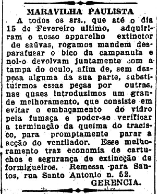 Maravilha Paulista - recall do aparelho extintor de formigas saúvas - em Santos