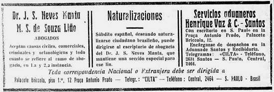 Servicios Aduaneros Henrique Vaz & C.- Santos Publicado no jornal Diario Espanhol, editado em espanhol na capital paulista, página 2 da edição de 10 de julho de 1922), no acervo Biblioteca Nacional/Rio de Janeiro (acesso: 10/7/2016)