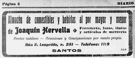 Almacén de comestibles y bebidas al por mayor y menor, de Joaquín Hervella Publicado no jornal Diario Espanhol, editado em espanhol na capital paulista, página 4 da edição de 10 de julho de 1922), no acervo Biblioteca Nacional/Rio de Janeiro (acesso: 10/7/2016)