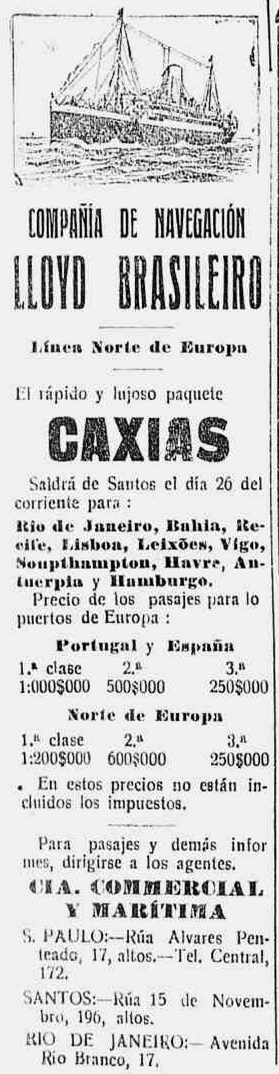 Lloyd Brasileiro - Cia. Commercial y Marítima Publicado no jornal Diario Espanhol, editado em espanhol na capital paulista, página 4 da edição de 10 de julho de 1922), no acervo Biblioteca Nacional/Rio de Janeiro (acesso: 10/7/2016)