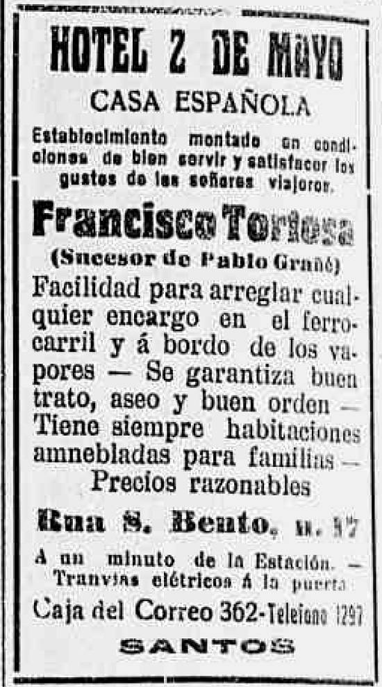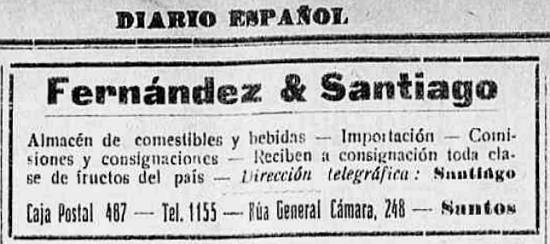 Fernández & Santiago - almacén de comestibles y bebidas; comisiones y consignaciones Publicado no jornal Diario Espanhol, editado em espanhol na capital paulista, página 6 da edição de 10 de julho de 1922), no acervo Biblioteca Nacional/Rio de Janeiro (acesso: 10/7/2016)