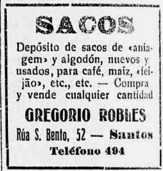 Sacos - depósito de Gregorio Robles Publicado no jornal Diario Espanhol, editado em espanhol na capital paulista, página 4 da edição de 10 de julho de 1922), no acervo Biblioteca Nacional/Rio de Janeiro (acesso: 10/7/2016)
