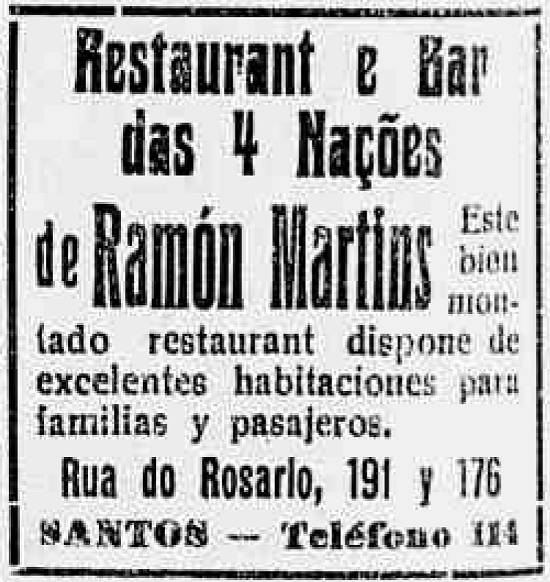 Restaurant e Bar das 4 Nações, de Ramón Martins Publicado no jornal Diario Espanhol, editado em espanhol na capital paulista, página 4 da edição de 10 de julho de 1922), no acervo Biblioteca Nacional/Rio de Janeiro (acesso: 10/7/2016)