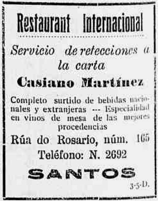 Restaurant Internacional, de Casiano Martínez Publicado no jornal Diario Espanhol, editado em espanhol na capital paulista, página 4 da edição de 10 de julho de 1922), no acervo Biblioteca Nacional/Rio de Janeiro (acesso: 10/7/2016)