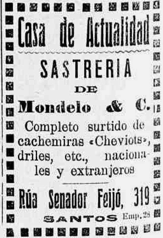 Casa de Actualidad - Sastreria de Mondelo & C. Publicado no jornal Diario Espanhol, editado em espanhol na capital paulista, página 4 da edição de 10 de julho de 1922), no acervo Biblioteca Nacional/Rio de Janeiro (acesso: 10/7/2016)