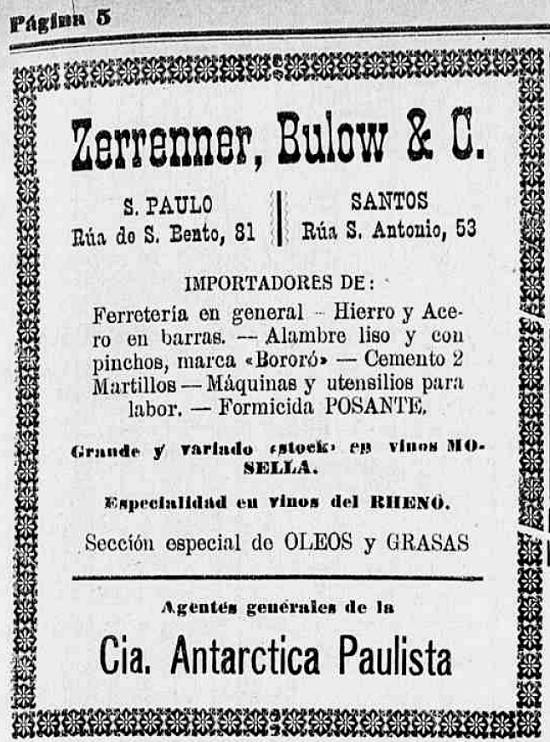 Zerrener, Bulow & C. - Cia. Antarctica Paulista Publicado no jornal Diario Espanhol, editado em espanhol na capital paulista, página 5 da edição de 10 de julho de 1922), no acervo Biblioteca Nacional/Rio de Janeiro (acesso: 10/7/2016)