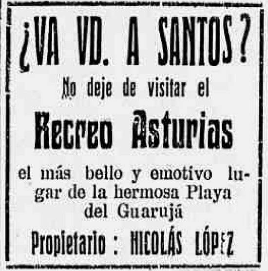 Recreo Asturias, de Nicolás López, na praia de Guarujá Publicado no jornal Diario Espanhol, editado em espanhol na capital paulista, página 5 da edição de 10 de julho de 1922), no acervo Biblioteca Nacional/Rio de Janeiro (acesso: 10/7/2016)