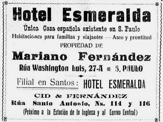 Hotel Esmeralda, de Cid & Fernández Publicado no jornal Diario Espanhol, editado em espanhol na capital paulista, página 5 da edição de 10 de julho de 1922), no acervo Biblioteca Nacional/Rio de Janeiro (acesso: 10/7/2016)