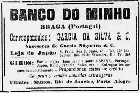 Banco do Minho - Garcia da Silva & C. (sucesores de Garacia Nogueira & C.)/Loja do Japão Publicado no jornal Diario Espanhol, editado em espanhol na capital paulista, página 6 da edição de 10 de julho de 1922), no acervo Biblioteca Nacional/Rio de Janeiro (acesso: 10/7/2016)