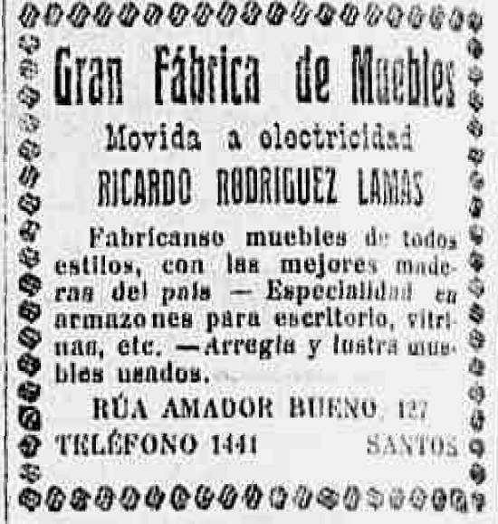 Gran Fabrica de Muebles - movida a electricidad - Ricardo Rodriguez Lamas Publicado no jornal Diario Espanhol, editado em espanhol na capital paulista, página 6 da edição de 10 de julho de 1922), no acervo Biblioteca Nacional/Rio de Janeiro (acesso: 10/7/2016)