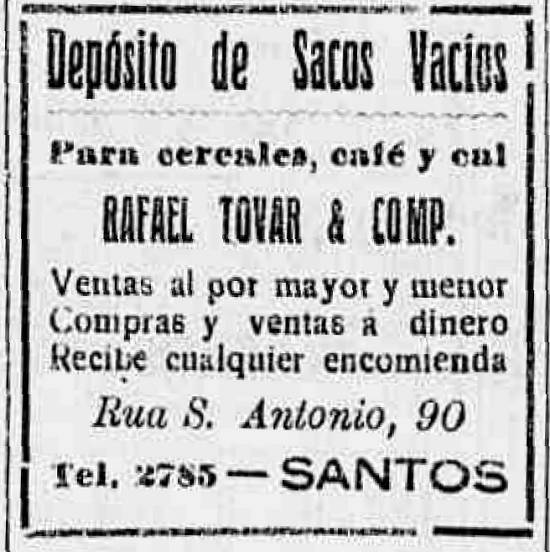Depósito de Sacos Vacios para cereales, café y cal - Rafael Tovar & Comp. Publicado no jornal Diario Espanhol, editado em espanhol na capital paulista, página 6 da edição de 10 de julho de 1922), no acervo Biblioteca Nacional/Rio de Janeiro (acesso: 10/7/2016)