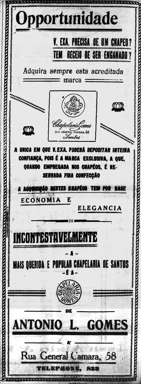 Chapelaria Gomes, de Antonio L. Gomes, na Rua General Câmara 58: "Incontestavelmente, a mais querida e popular chapelaria de Santos"