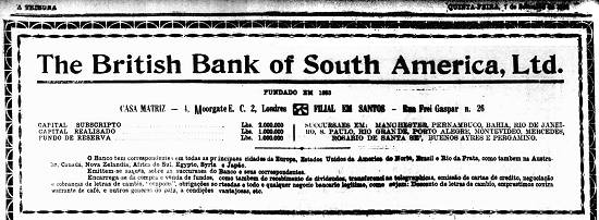 The British Bank of South America, Ltd., filial em Santos na Rua Frei Gaspar, 26