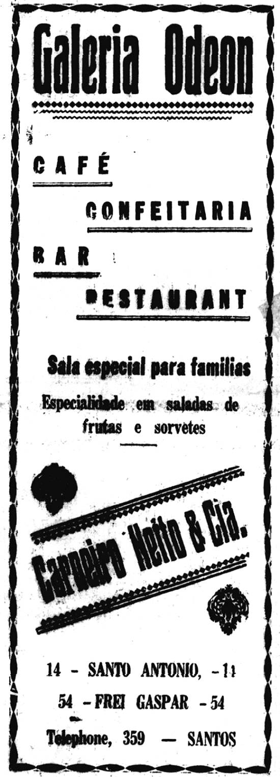 Galeria Odeon, na Rua Frei Gaspar, 54 e na antiga Rua Santo Antonio (atual Rua do Comércio), 14: "Especialidade em saladas de frutas e sorvetes"