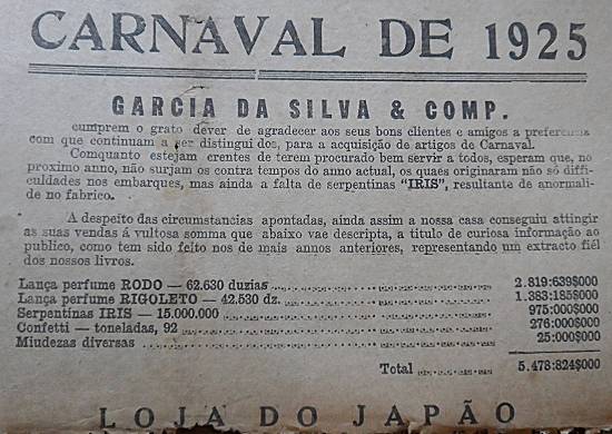Garcia da Silva & Comp./Loja do Japão - artigos carnavalescos - total vendido: Lança-perfume Rodo - 62.630 dúzias; Lança-perfume Rigoleto - 42.530 dúzias; Serpentinas Iris - 15 milhões; Confeti - 92