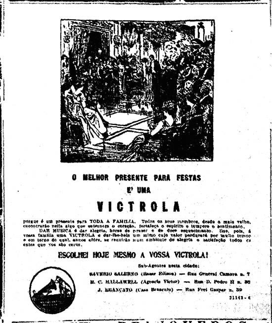 Victrola, o melhor presente para festas - subagentes em Santos: Bazar Edison (Saverio Salerno), Agência Victor (H. C. Hallawell) e Casa Brancato (J. Brancato)