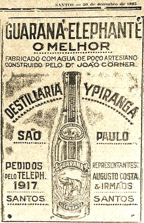 "Guaraná Elephante - A Melhor" - Fabricado com água de poço artesiano construído pelo dr. João Corner - Destilaria Ypiranga, de São Paulo/SP. Representantes em Santos: Augusto Costa & Irmãos