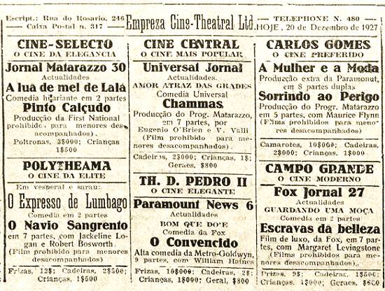 Cinemas afliados à Empresa Cine Theatral: Selecto, Central, Carlos Gomes, Polytheama, Theatro D. Pedro II, Campo Grande