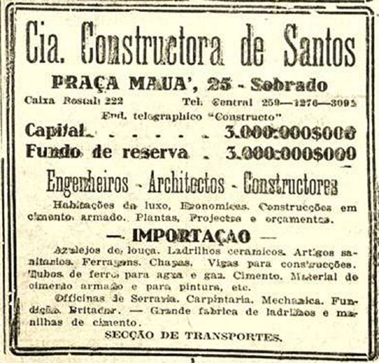 Companhia Constructora de Santos - Engenheiros, arquitetos, construtores, importação de materiais, oficinas de serraria, carpintaria, mecânica, fundição, britador, fábrica de ladrilhos e manilhas de cimento, seção de transportes
