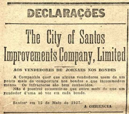 The City of santos Improvements Cmpany, Limited - "Aos vendedores de jornais nos bondes: A Companhia quer que alguns endedores usem de um pouco mais de compostura nos bondes e que incomodem menos. Os infratores são bem conhecidos. Não é possível consentir-se que entre mais do que um vendedor d'uma só vez em cada bonde"