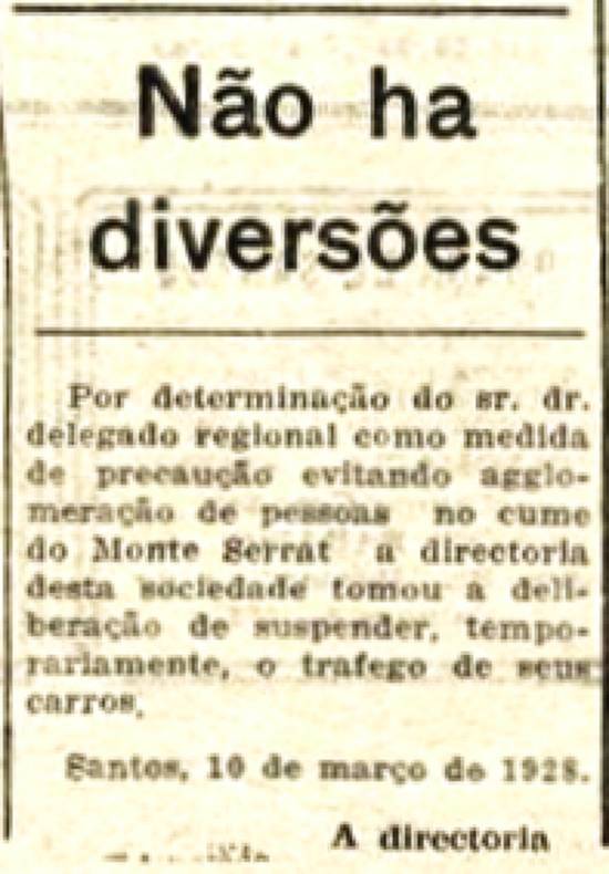 "Não há diversões" - Monte Serrat fecha acesso pelo funicular após os desabamentos da encosta ocorridos dias antes, com as chuvas do dia 10/3/1928