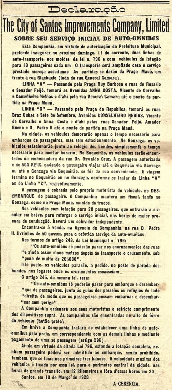 Declaração - The City of Santos Improvements Company, Limited - Sobre seu serviço inicial de auto-ônibus
