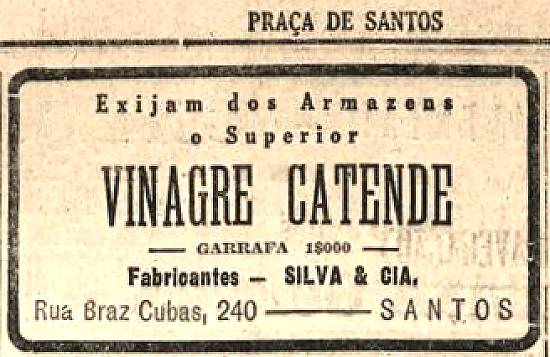Vinagre Catende, fabricado por Silva & Cia., na Rua Braz Cubas, 240, Santos