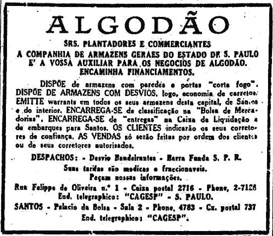 Companhia de Armazéns Gerais do Estado de S. Paulo - negócios com algodão em Santos