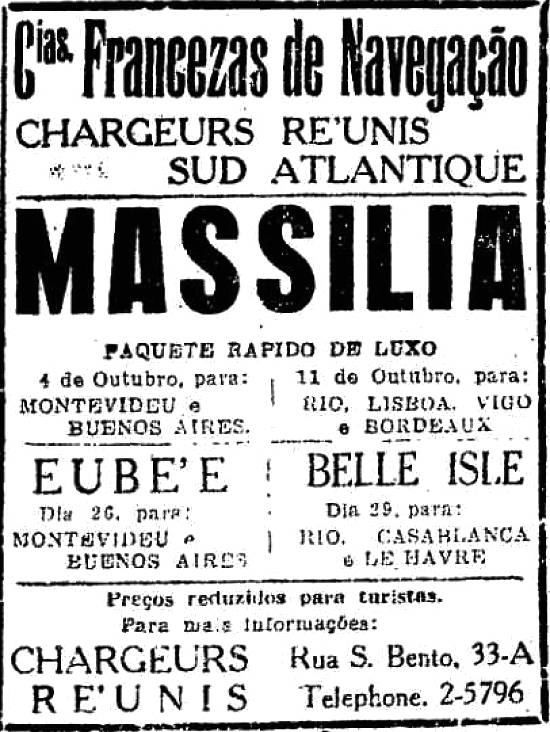 Chargeurs Réunis - agentes da francesa Chargeurs Réunis - Sud Atlantique Publicado no jornal O Estado de São Paulo em 26 de julho de 1935, página 14 (Acervo Estadão)