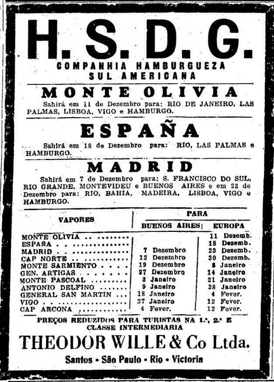 Theodor Wille & Co. Ltda., agentes em Santos da HSDG Companhia Hamburgueza Sul Americana Publicado no jornal O Estado de São Paulo em 7 de dezembro de 1935, pág. 15 (Acervo Estadão)