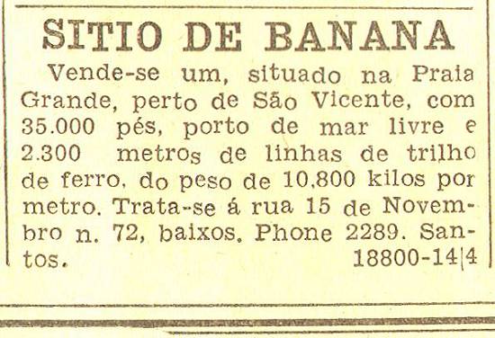 Sítio de banana em Praia Grande Publicado no jornal santista A Tribuna em 6 de abril de 1938, página 16 (Classificados) (exemplar no acervo do historiador Waldir Rueda)