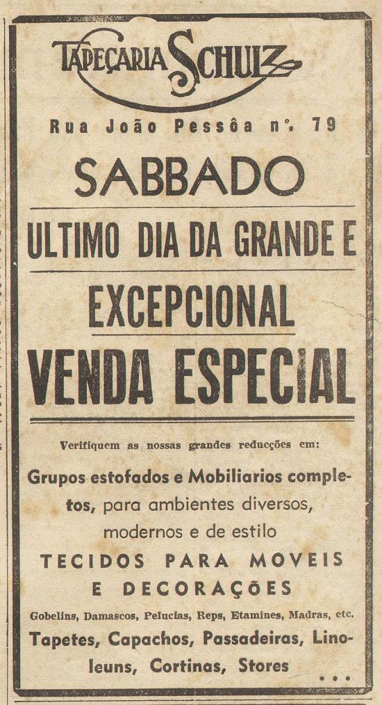 Tapeçaria Schulz Publicado no jornal santista A Tribuna em 7 de setembro de 1938 (exemplar no acervo do historiador Waldir Rueda)