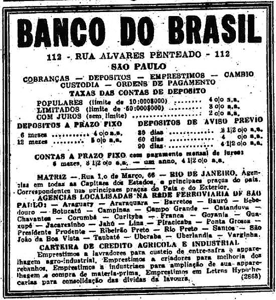 Banco do Brasil - agências localizadas na rede ferroviária de São Paulo: inclusive Santos Publicado no jornal O Estado de São Paulo em 8 de março de 1940, página 11 (Acervo Estadão)